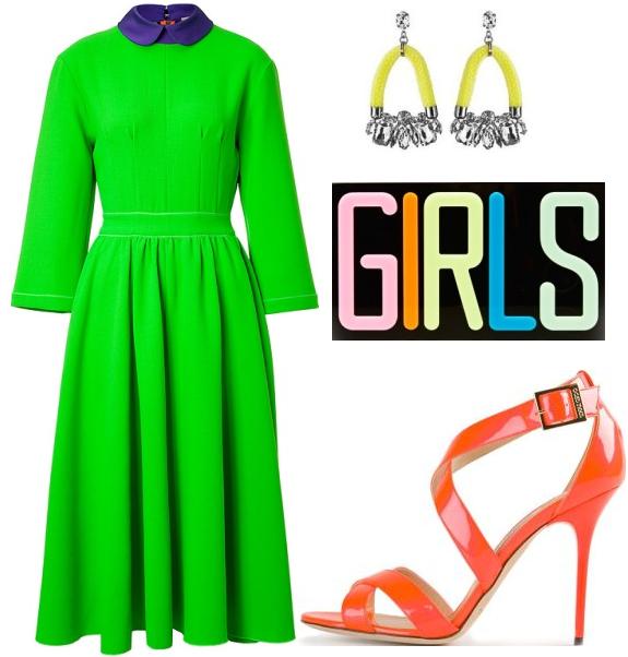 1. ROKSANDA ILINCIC 'Hunter' wool-crepe dress, available at STYLEBOP. 2. nOir 'Gohain' neon yellow drop earrings, available at BLUEFLY. 3. CHARLOTTE OLYMPIA 'Girls' Pandora clutch, available at MODA OPERANDI. 4. JIMMY CHOO 'Lottie' neon flame orange sandals, available at FARFETCH.