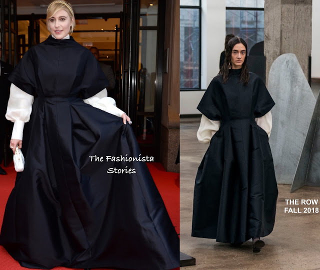 As a guest of TIFFANY & CO who's jewelry she also wore, clothing wise, she opted for a THE ROW FALL 2018 dress. Her black silk gown with three-quarter sleeves & a pleated skirt, featured contrasting white long sleeve underneath.