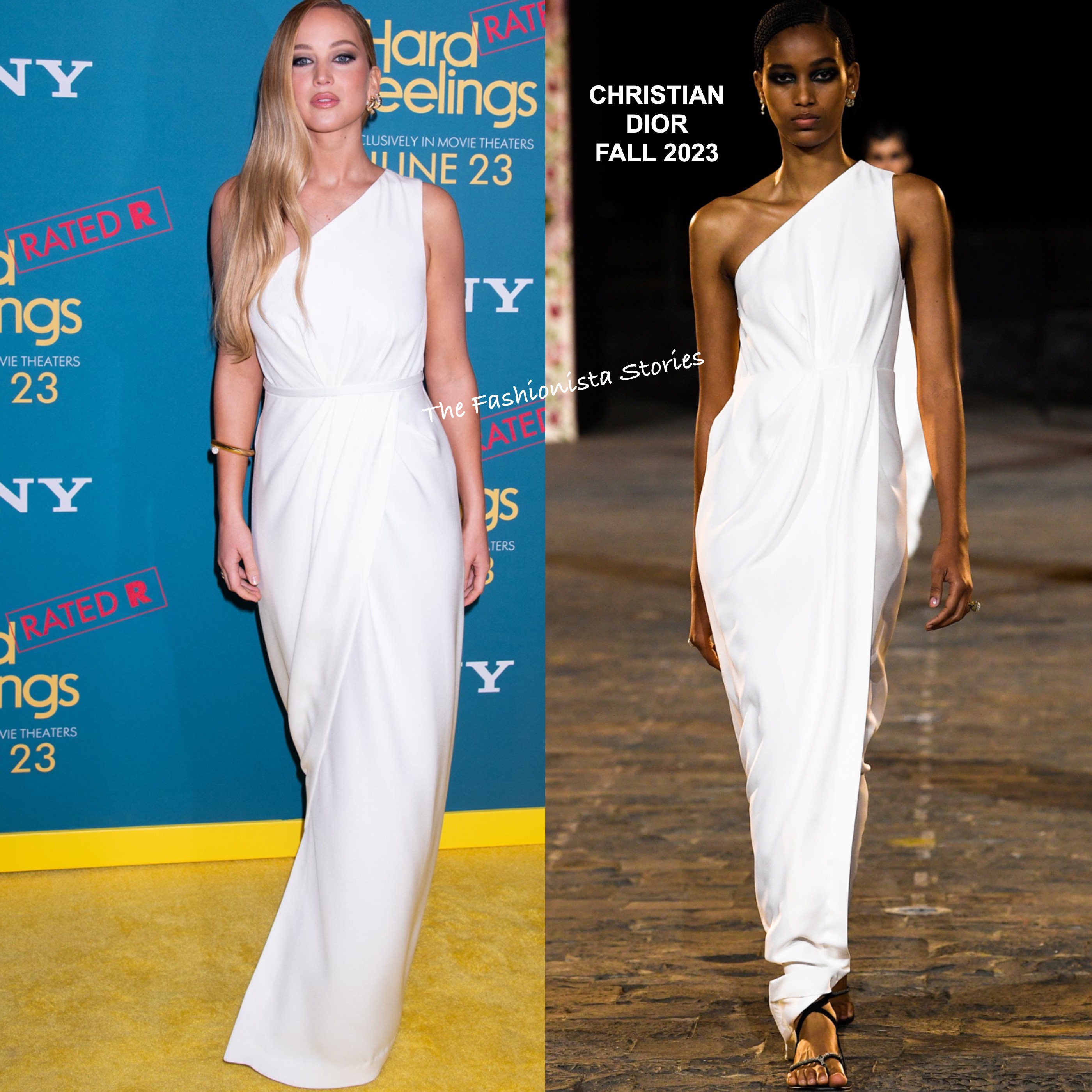 Jennifer Lawrence looked pretty wearing a CHRISTIAN DIOR FALL 2023 white one-shoulder, faux wrap dress which was accessorized with gold jewelry. On the beauty end, her look was simple but flawless with a slight edge to complete her look.