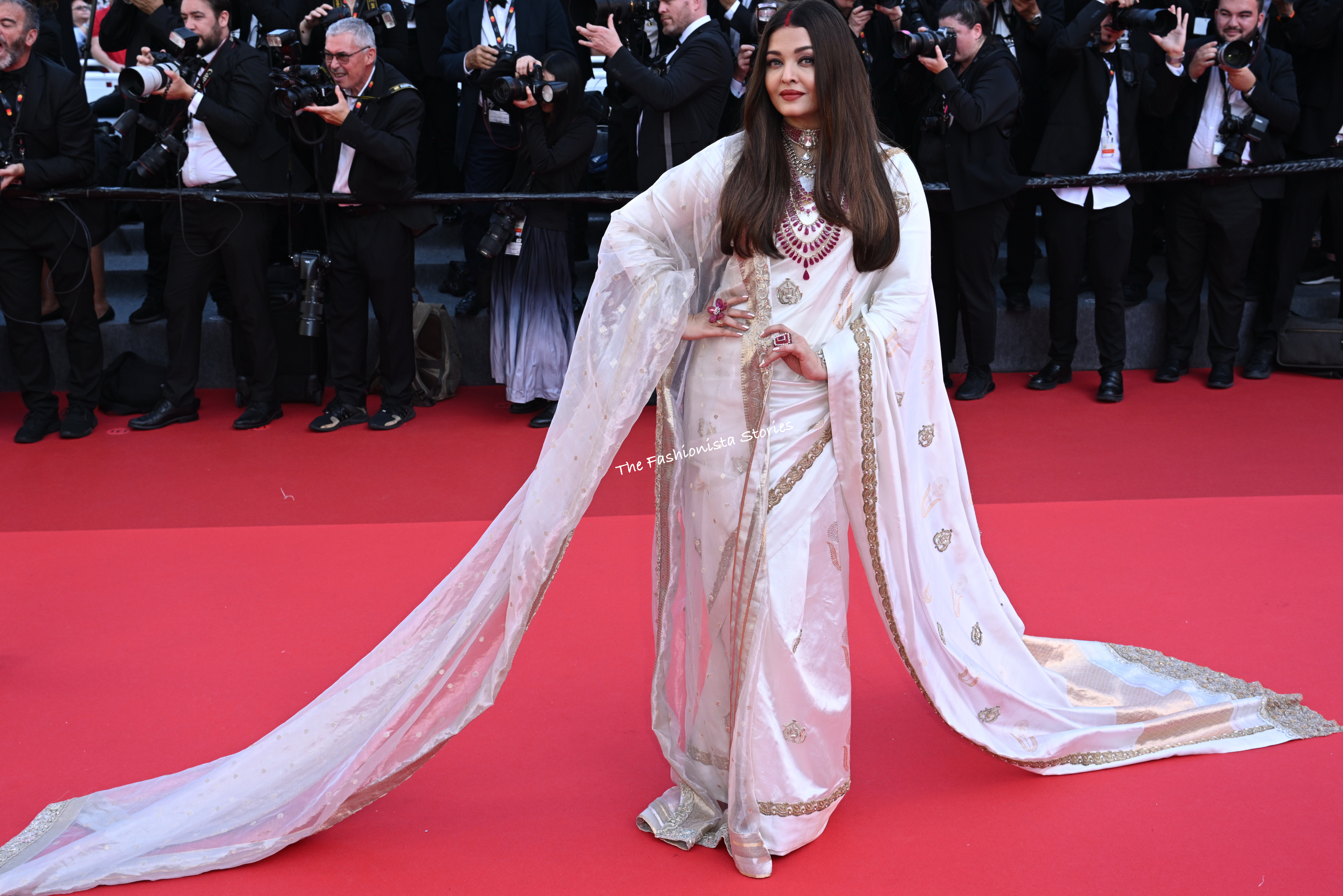 Aishwarya Rai graced the red carpet wearing a MANISH MALHOTRA custom handwoven Kadwa Banarasi saree and heirloom high jewelry. The saree looks a little too long, but you can't deny how beautiful she looked.